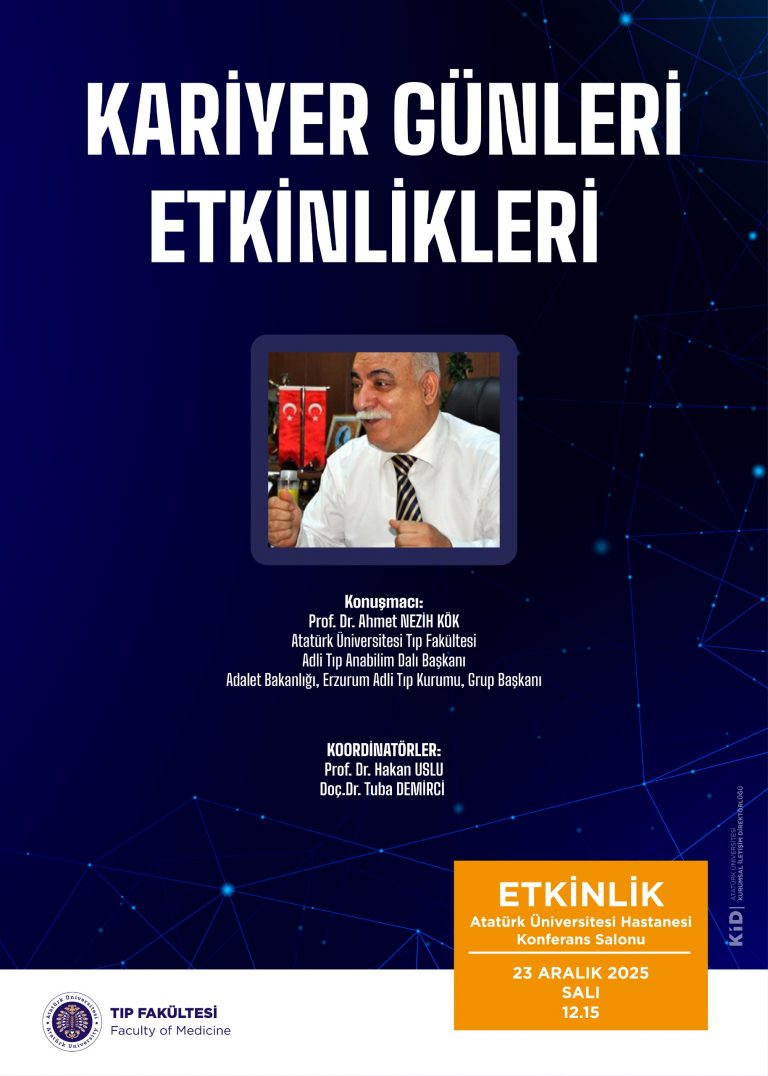 Atatürk Üniversitesi Tıp Fakültesi tarafından düzenlenen Kariyer Günleri Etkinliği kapsamında, Adli Tıp alanındaki birikim ve deneyimlerini paylaşmak üzere Prof. Dr. Ahmet Nezih Kök’ün katılımlarıyla konferans gerçekleştirilecektir.