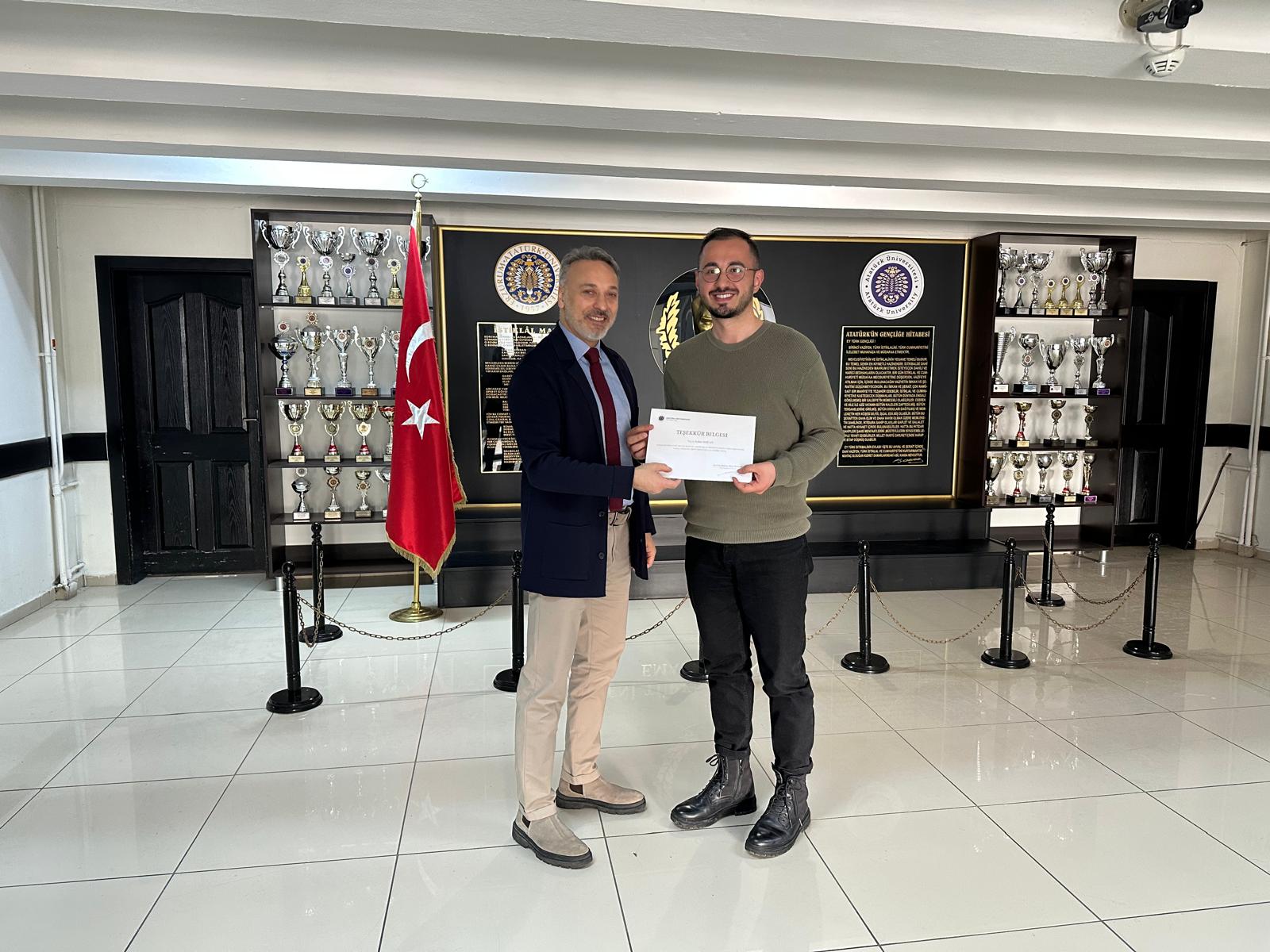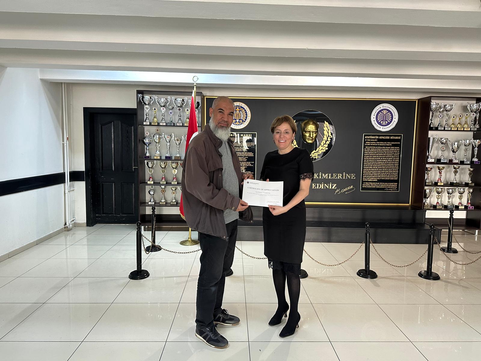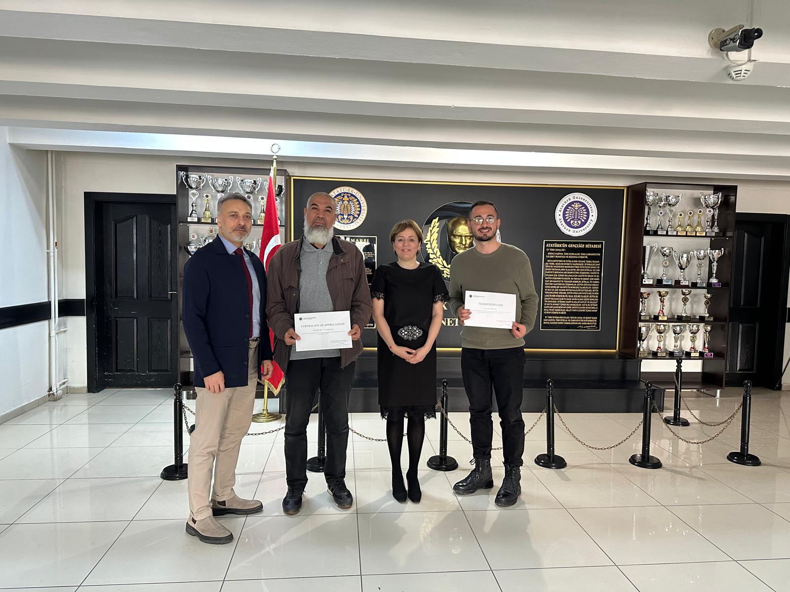 Kursların tamamlanmasının ardından, eğitim sürecine katkı sağlayan Prof. Dr. A. M. Abd El-Aty ve Selim Doğan’a teşekkür belgeleri takdim edilmiştir. Katılım gösteren tüm akademisyenlerimize ve emeği geçen herkese teşekkür ederiz.