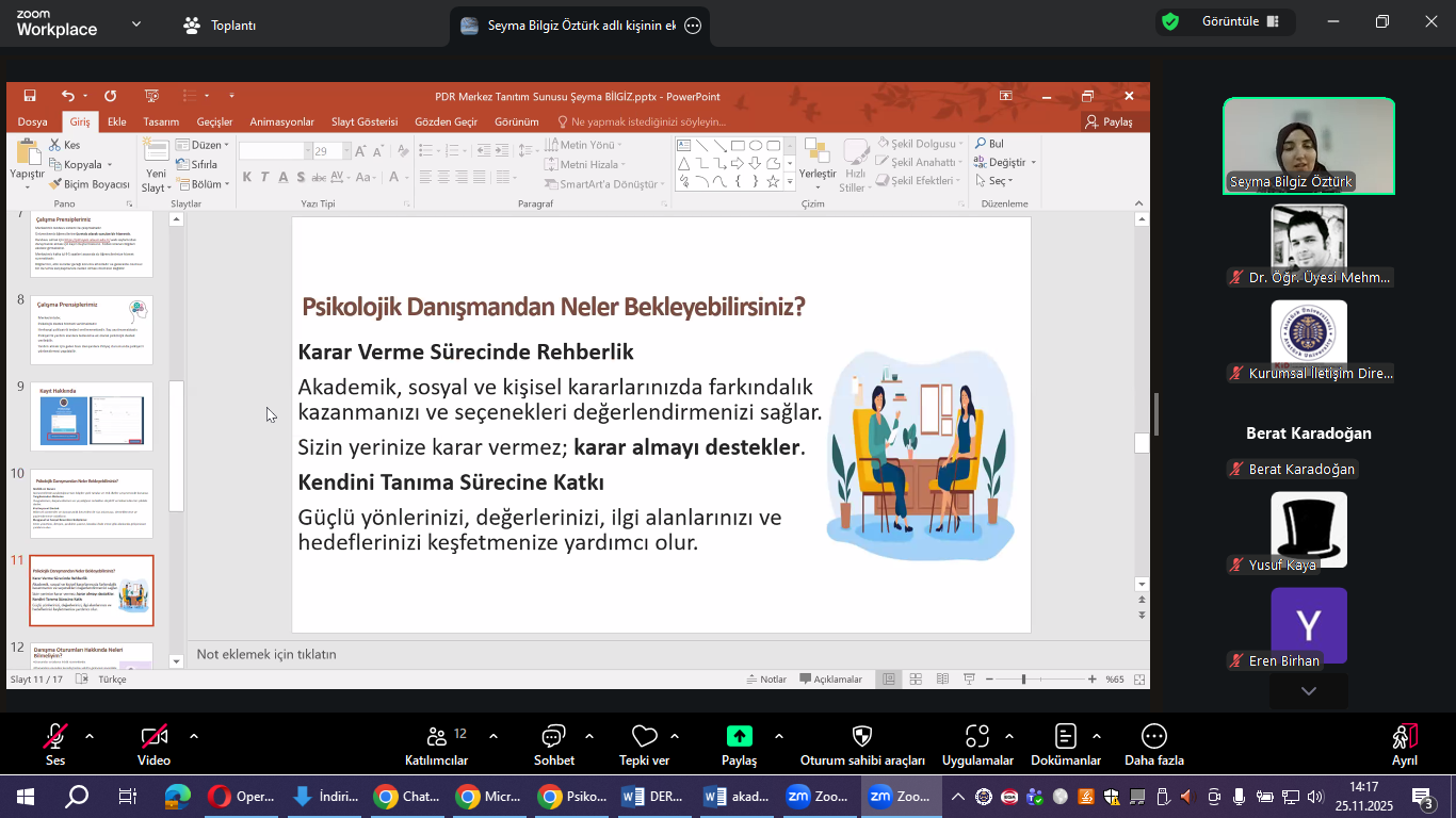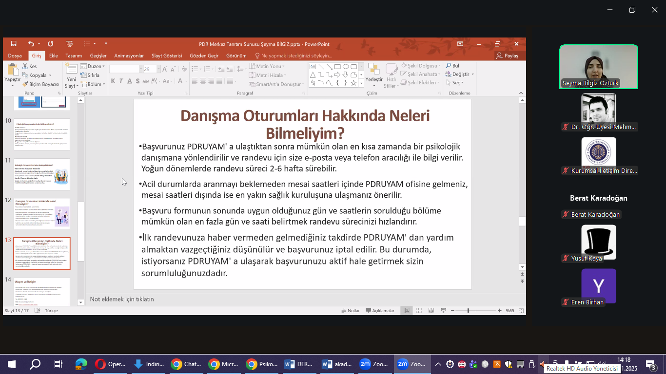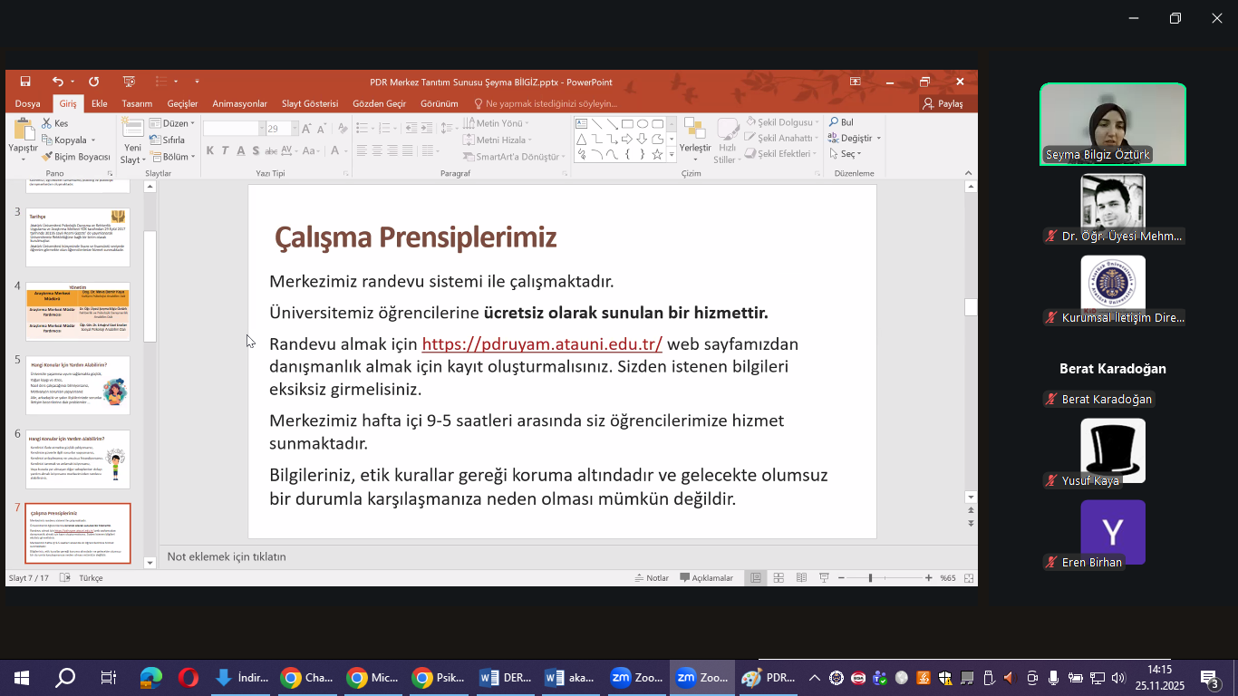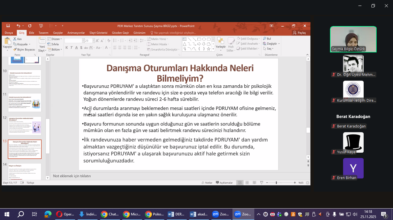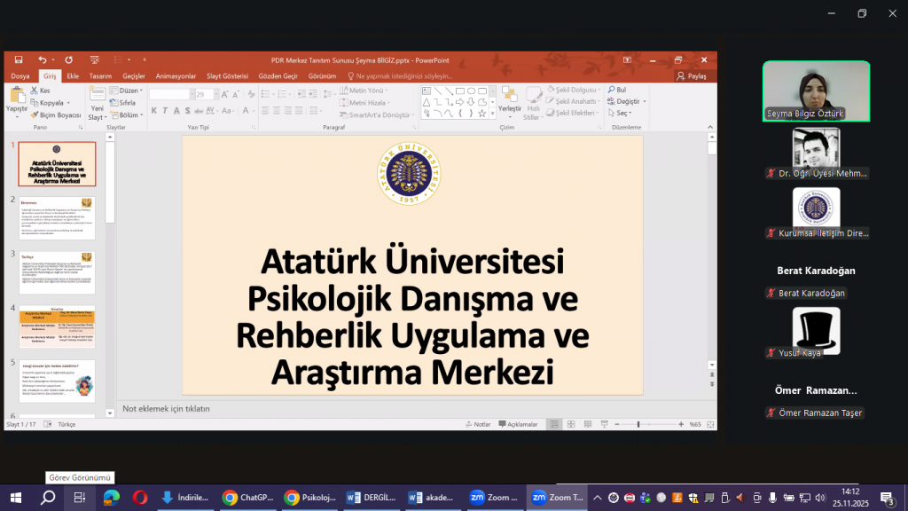 Toplantıda, merkezin sağladığı psikolojik destek hizmetleri, danışmanlık süreçleri, merkezden nasıl yararlanılabileceği ve yürütülen akademik/uygulamalı çalışmalar hakkında ayrıntılı bilgiler paylaşıldı. Etkinlik, Psikolojik Danışma ve Rehberlik Uygulama ve Araştırma Merkezi Müdür Yardımcısı Dr. Öğr. Üyesi Şeyma Bilgiz Öztürk tarafından gerçekleştirilen sunumla devam etti.