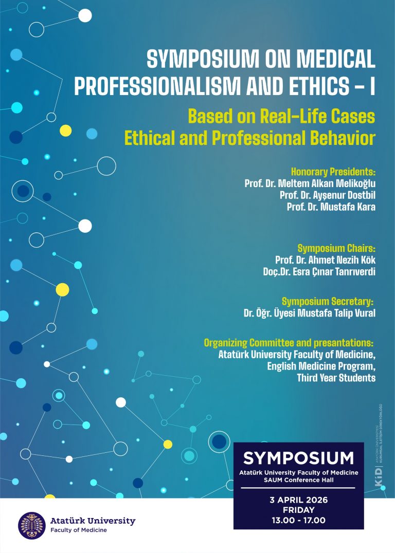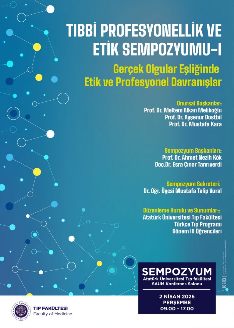 Atatürk Üniversitesi Tıp Fakültesi Türkçe Tıp Programı Dönem III öğrencileri tarafından düzenlenen Tıbbi Profesyonellik ve Etik Sempozyumu–I, 2 Nisan 2026 Perşembe günü saat 09.00–17.00 saatleri arasında Atatürk Üniversitesi Tıp Fakültesi SAUM Konferans Salonu‘nda gerçekleştirilecektir.