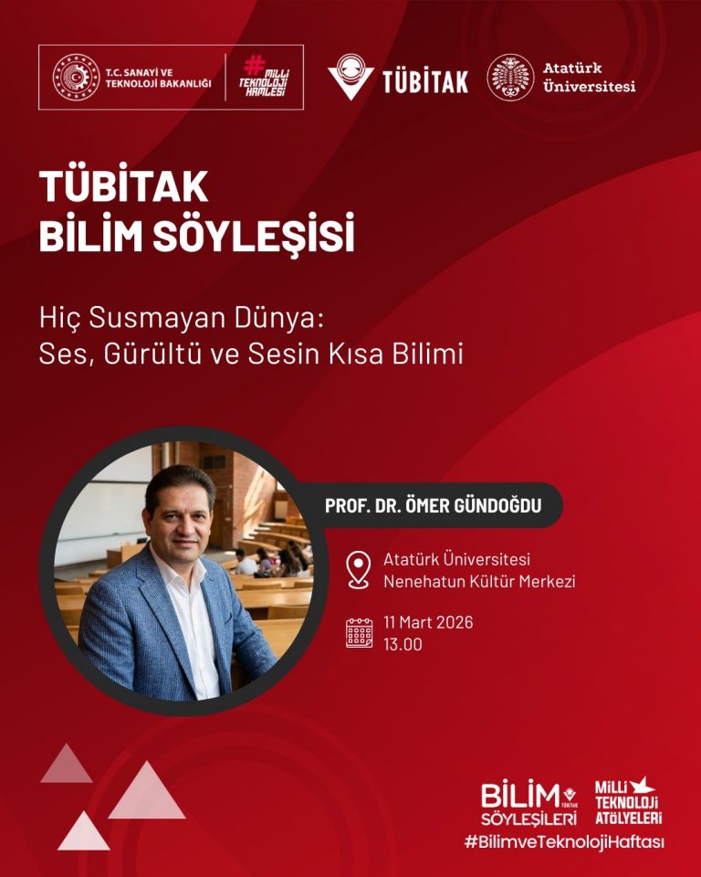 Atatürk Üniversitesi Mühendislik Fakültesi Makine Mühendisliği Anabilim Dalı Başkanı Sayın Prof. Dr. Ömer Gündoğdu’nun konuşmacı olarak katılacağı “Hiç Susmayan Dünya: Ses, Gürültü ve Sesin Kısa Bilimi” başlıklı söyleşi düzenlenecektir.