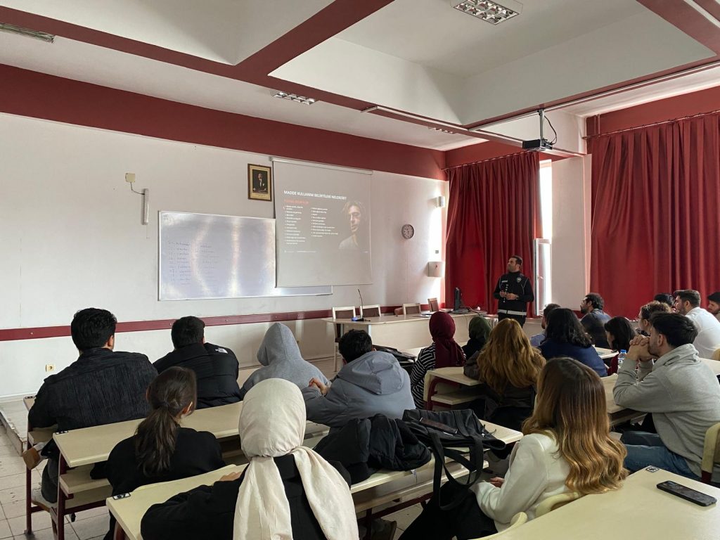 Üniversite öğrencilerinin ve gençlerin madde bağımlılığı konusunda doğru bilgiye kaynağından ulaşmalarını sağlamak amacıyla Gençleri uyuşturucunun fiziksel, psikolojik ve sosyal zararlarına karşı korumak, yasal sonuçlar hakkında bilgilendirmek ve riskli durumlardan kaçınma becerilerini edinmeleri için Erzurum Emniyet Müdürlüğü Narkotik Suçlarla Mücadele Şubesi Ekipleri tarafından görsel sunumlar ve bilgilendirici videolar aracılığıyla bilgilendirme eğitimi gerçekleştirilmiştir.