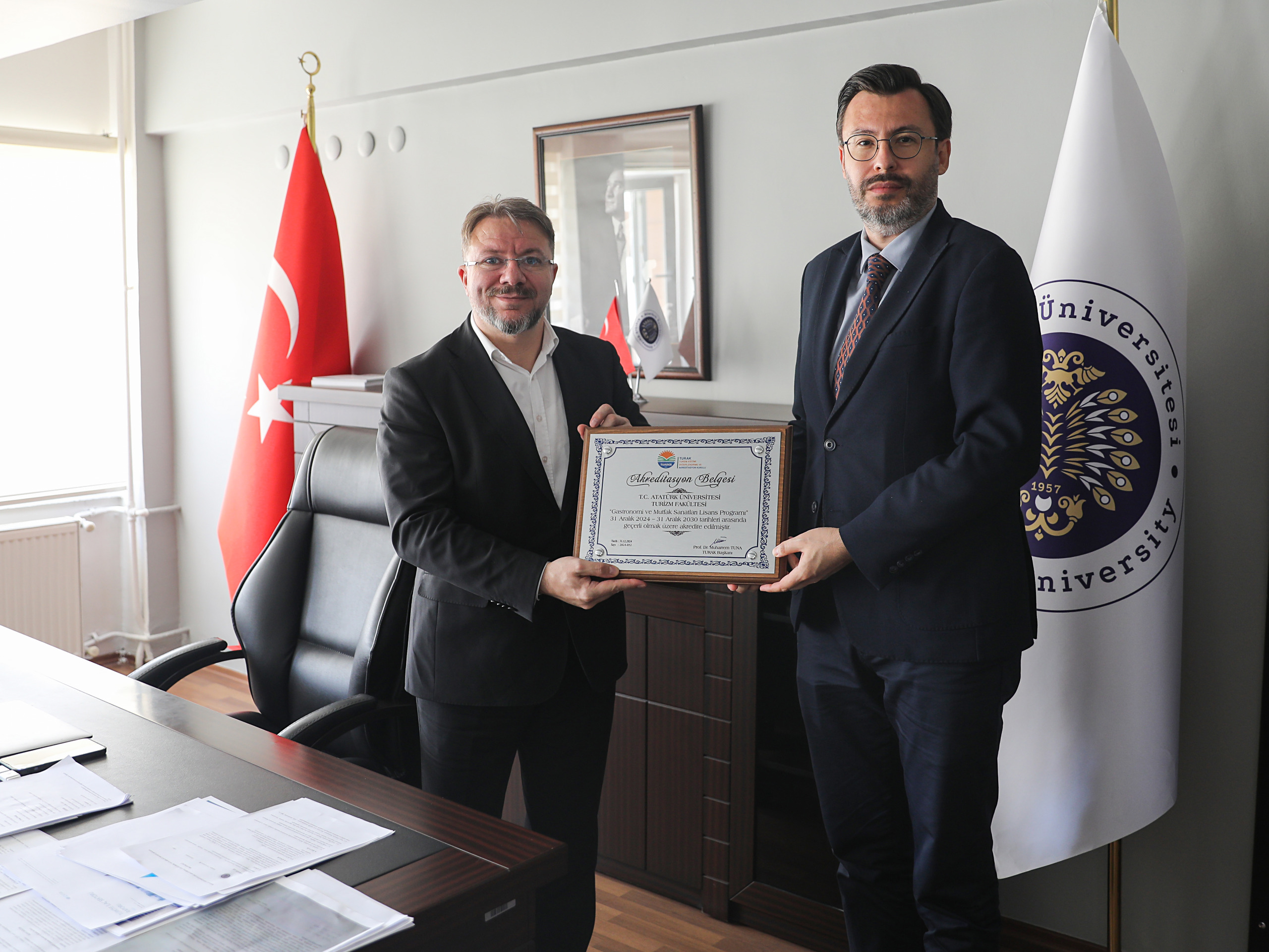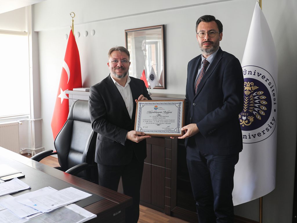TURAK tarafından tam akretide (6 yıl) edilen Turizm Fakültesi Gastronomi ve Mutfak Sanatları bölümüne akreditasyon belgesi takdim edildi. Akreditasyon belgesini TURAK adına İstanbul Gelişim Üniversitesi Genel Sekreteri Doç. Dr. Serdar EGELİ, Atatürk Üniversitesi Rektör Vekili Prof. Dr. Hasan TÜRKEZ’e takdim etti. Törende Turizm Fakültesi Dekanı Prof. Dr. Gökalp N. SELÇUK ile Dekanı yardımcısı Prof.Dr. Ahmet ÇAVUŞ ve GMS Bölüm Başkan vekili Doç. Dr. Zühal OKÇU hazır bulundu.