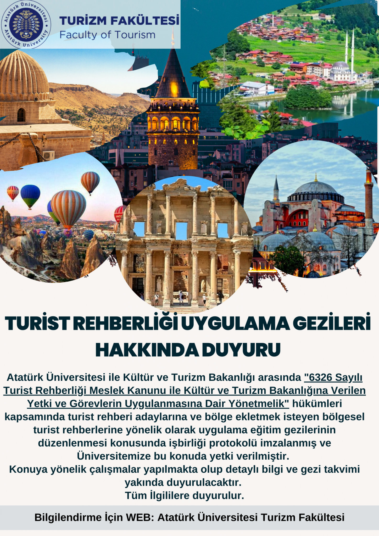 Atatürk Üniversitesi ile Kültür ve Turizm Bakanlığı arasında “6326 Sayılı Turist Rehberliği Meslek Kanunu ile Kültür ve Turizm Bakanlığına Verilen Yetki ve Görevlerin Uygulanmasına Dair Yönetmelik” hükümleri kapsamında turist rehberi adaylarına ve bölge ekletmek isteyen bölgesel turist rehberlerine yönelik olarak uygulama eğitim gezilerinin düzenlenmesi konusunda işbirliği protokolü imzalanmış ve Üniversitemize bu konuda yetki verilmiştir.
