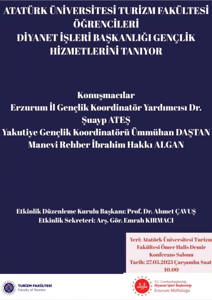 Atatürk Üniversitesi Turizm Fakültesi’nde 27 Mayıs 2025’de Prof.Dr. Ahmet Çavuş’un Toplumsal Duyarlılık projesi kapsamında gerçekleştirilen ”Gençlik Merkezleri Tanıtımı ve İş Birliği” programı büyük ilgiyle tamamlandı!