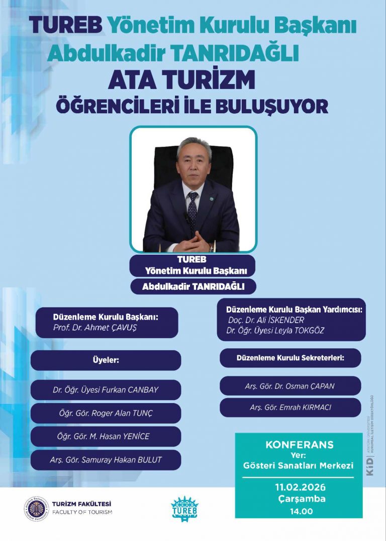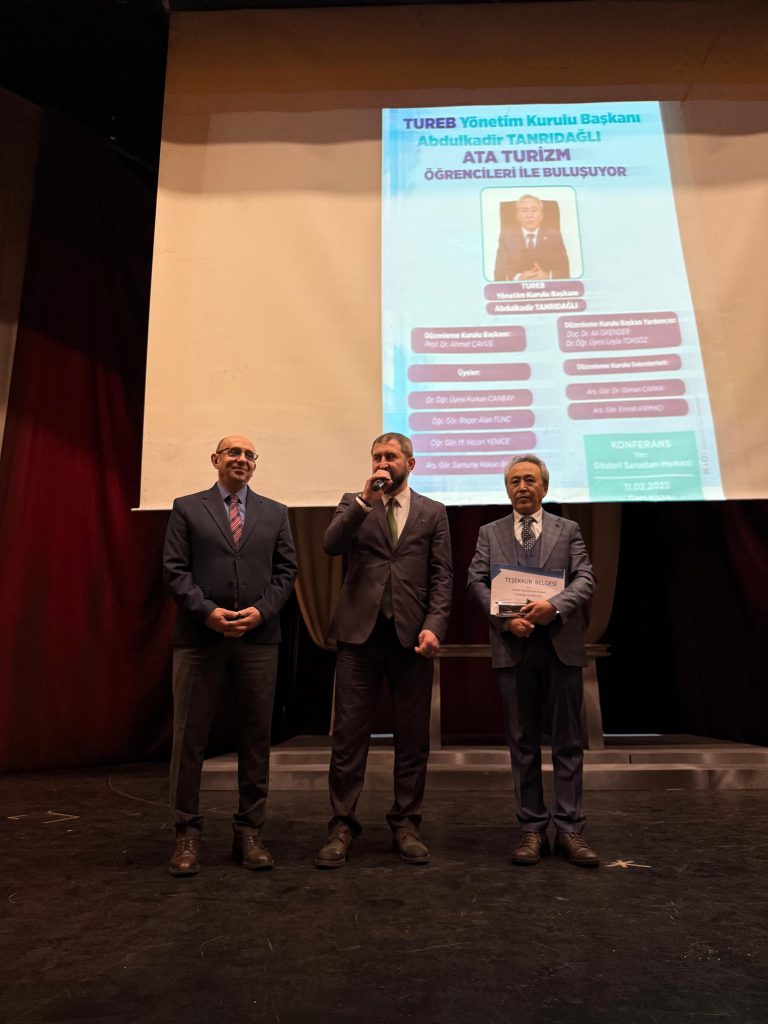Öğleden sonra gerçekleştirilen “Ata Turizm Öğrencileri ile Buluşuyor” etkinliği ise yoğun katılımla düzenlendi. Öğrenciler, rehberlik mesleğine ilişkin merak ettikleri soruları doğrudan TUREB Başkanı Abdulkadir Tanrıdağlı’ya yönelterek önemli bilgiler edinme fırsatı buldu. Program sonunda ödül ve teşekkür takdimleri gerçekleştirildi.