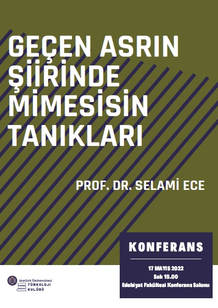Türk Dili ve Edebiyatı bölümünün öğrenci kulüplerinden Türkoloji Kulübü 17 Mayıs 2022 Salı günü saat 15.00’te, fakülte konferans salonunda, bölümümüz öğretim üyesi Prof. Dr. Selami ECE’nin katılımıyla “Geçen Asrın Şiirinde Mimesisin Tanıkları” başlıklı bir konferans gerçekleştirecektir.