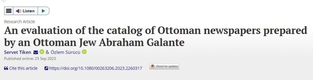 Türk Dili ve Edebiyatı bölümü öğretim üyelerinden Doç. Dr. Servet Tiken ve Arş. Gör. Özlem Sürücü, Londra’da 60 yıllık yayın geçmişine sahip, uluslararası ilişkiler, siyaset bilimi ve edebiyat alanlarında multidisipliner araştırmalara yer veren SSCI indeksli Middle Eastern Studies dergisinde “An evaluation of the catalog of Ottoman newspapers prepared by an Ottoman Jew Abraham Galante” başlıklı makale yayınladılar.