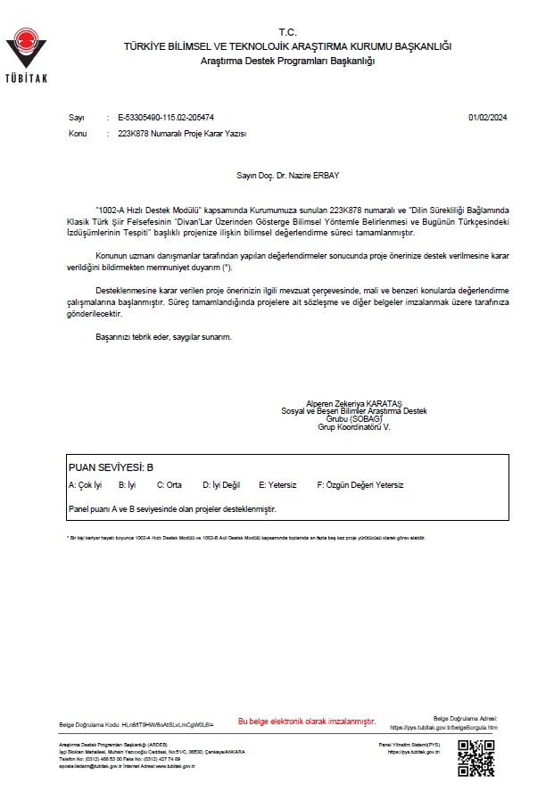 Doç. Dr. Nazire Erbay’ın “Dilin Sürekliliği Bağlamında Klasik Türk Şiir Felsefesinin `Divan’lar Üzerinden Gösterge Bilimsel Yöntemle Belirlenmesi ve Bugünün Türkçesindeki İzdüşümlerinin Tespiti” başlıklı projesi kabul edildi.