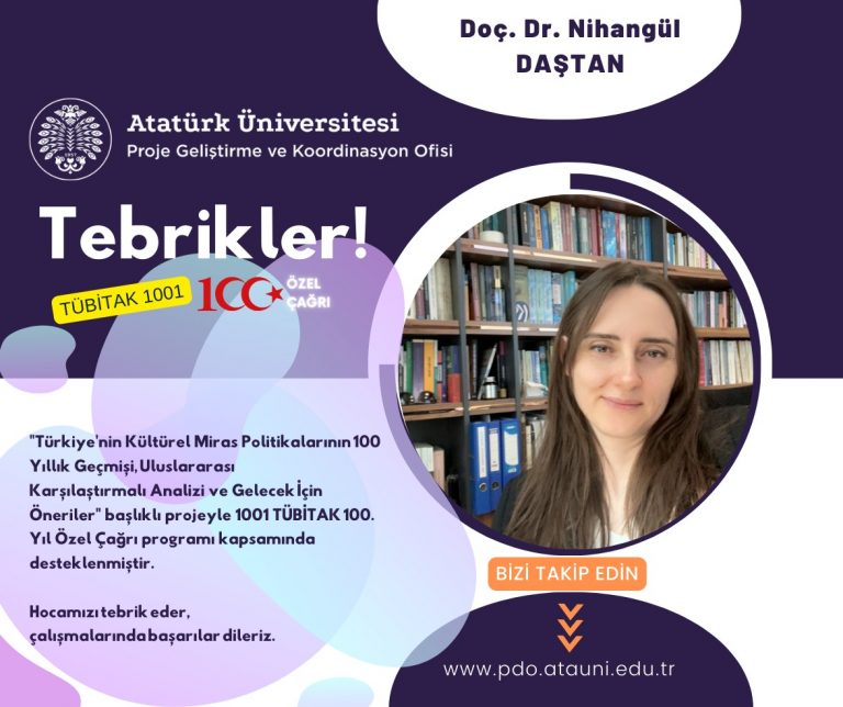 Türk Dili ve Edebiyatı bölümü öğretim üyelerinden Doç. Dr. Nihangül Daştan’ın yürütücülüğünde sunulan “Türkiye’nin Kültürel Miras Politikalarının 100 Yıllık Geçmişi, Uluslararası Karşılaştırmalı Analizi ve Gelecek İçin Öneriler” başlıklı proje, Türkiye Bilimsel ve Teknolojik Araştırma Kurumu (TÜBİTAK) 1001 tarafından desteklenmeye lâyık görüldü.