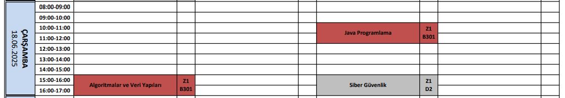 *Aşağıdaki görsellerde her bir bölüm için sınavların Oltu kampüsü ve merkez kampüste hangi dersliklerde yapılacağına dair örnekler verilmiştir. Örneğin Algoritmalar ve Veri Yapıları sınavı Uygulamalı Bilimler Fakültesi’nde Z1 dersliğinde, Teknik Bilimler Meslek Yüksekokulu’nda B301 dersliğinde yapılacaktır. Sınav programları fakültenin web sayfasında duyrulmuştur.