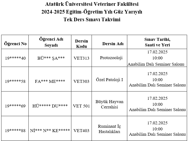 2024-2025 Eğitim-Öğretim Yılı Güz Yarıyılı Tek Ders Sınavı Takvimi