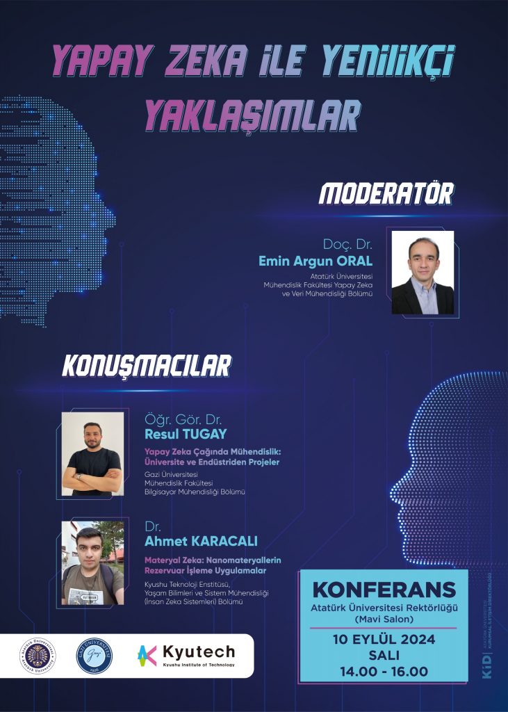 Atatürk Üniversitesi Yapay Zeka ve Veri Mühendisliği Bölümü ile Kyushu Institute of Technology Üniversitesi iş birliği kapsamında günümüzün en dikkat çeken teknolojik gelişmelerinden biri olan yapay zeka alanında farkındalık oluşturmak ve öğrencileri bu alandaki yeniliklerle buluşturmak amacıyla “Yapay Zeka ile Yenilikçi Yaklaşımlar” konulu bir konferans düzenlendi.