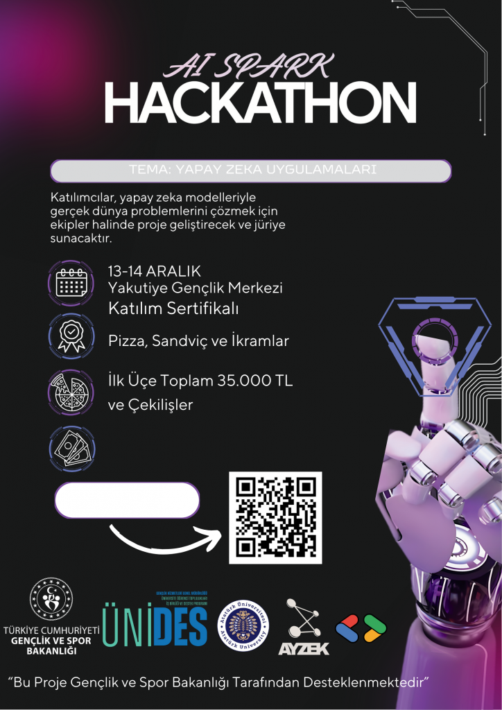 12 Aralık 2025 AYZEK – AI SPARK Hackathon Mühendislik Fakültesi Yapay Zeka ve Veri Mühendisliği Bölümü Kulübü AYZEK’in ve AI SPARK’ın düzenlediği, yapay zeka ve sektörü birleştiren bu özel yarışmaya davetlisiniz!Tarih: 13 Aralık 2025Saat: 12:00Yer: Yakutiye Gençlik Merkezi Erzurum