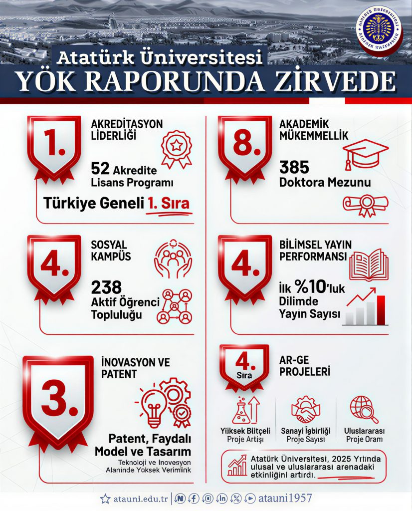 Atatürk Üniversitesi, eğitim kalitesini belgeleyen “Akredite Lisans Programı Sayısı” göstergesinde 52 programla Türkiye genelinde 1. sırada yer alarak bu alandaki liderliğini tescilledi. Nitelikli akademik çıktıların bir göstergesi olan “Doktora Mezun Sayısı”nda 385 mezun ile 8. sıraya yerleşen Atatürk Üniversitesi, Türkiye’nin doktoralı insan kaynağı ihtiyacına en büyük katkıyı sunan kurumlardan biri oldu. Ayrıca, 238 aktif öğrenci topluluğu ile sosyal kampüs imkânları açısından da Türkiye’nin en zengin 4. üniversitesi olma başarısını gösterdi.